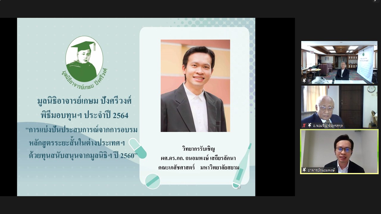 มูลนิธิเกษม ปังศรีวงศ์ จัดพิธีมอบทุนการศึกษาออนไลน์ผ่านโปรแกรม zoom ในวันที่ 2 ธันวาคม 2564