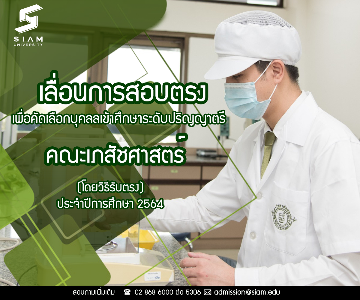 ประกาศรายชื่อผู้มีสิทธิ์เข้าสอบข้อเขียน เพื่อเข้าศึกษาระดับปริญญาตรี หลักสูตรเภสัชศาสตรบัณฑิต คณะเภสัชศาสตร์ สาขาวิชาการบริบาลทางเภสัชกรรม มหาวิทยาลัยสยาม ปีการศึกษา 2564 โดยวิธีรับตรง (สอบข้อเขียน)